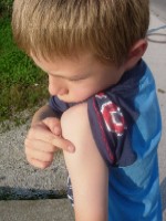 The dreaded vaccinations loomed large again as it was four weeks from the first ones and the second shots were now due. Primoz said that every village had it’s own doctor’s surgery (which was really a mini medical centre complete with dentist) and we just had to turn up and we would be seen. So we did and were! The boys were not keen, to put it mildly, but it was all done eventually and we went and had lunch to celebrate. But there is a picture of Rory inspecting the damage!