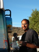 The campsite at Taghazout, tries hard to offer lots of different services to the people staying. You could get curtains and blinds made to measure for the motorhome, your haircut (I dipped out of that one; and the boys wouldn’t even entertain the idea!), satellite dishes fitted, solar panels fitted and your motorhome painted. We decided to have a modest painting done on the mirrors, although Josh and Rory would have liked a more flamboyant picture across the front and or sides. We were really pleased with the results which we think personalises the motorhome without being too over the top. So, we have included a photograph of the artist.