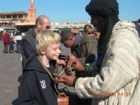Josh set his heart on a laser key ring with 50 different attachments which shine (rather peculiar) images on to the wall. While these intensive negotiations were being carried on, I noticed Gary at the djellabah stall (the long, hooded, cloth gowns that the men wear as coats) he was chatting away to the stallholder and a European man. Josh did the deal with the laser key ring and we went over to see what Gary was up to. It became pretty clear, when he asked me which colour I thought would suit him best! To cut a long story short, “we” bought two djellabahs- one for Gary and one for Josh. I have to say that Josh’s one looked great on him, it is blue with a dark stripe and fitted him to a tee.