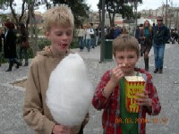 | On Monday, we took the bus into the centre of Athens and decided to walk around the pedestrian area at the bottom of the Acropolis and go and see The Agora the ancient city’s marketplace and administrative centre. As it happened, it was a public holiday (it seems we only have to enter a country for a public holiday to be declared!) and all the sites were free, which accounted for the thousands of people walking the same route that we were. The holiday is outwardly celebrated by kites and every child (bar two!) seemed to have one; it certainly made for a colourful day out. Because we were too mean to buy kites, we did a deal and they had candy floss and popcorn instead.
