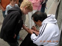 We started off in Gamla Stan, the old town, which is home to the Royal Place, (winter residence of the Swedish royal family), the Nobel Museum and any number of shops selling Swedish souvenirs.  We were walking down the Vasterlanggatan, the main tourist street, when Josh spotted a man doing henna tattoos, just what he has always wanted, he assured us. There was no way that Rory was going to be left out of the proceedings, so we had two boys wanting tattoos, so Gary felt a discount coming on.  After doing patch tests (you know how uncool mothers can be!!) and establishing that the money was definitely coming out of their pocket money, they were on! The picture shows Josh being brave, he wasn’t sure if the syringe had a needle in it or not – not.